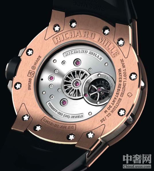 Richard Mille希望打造一枚容易使用的腕表。Richard Mille表廠眾多機芯與表殼工程師耗費時日精心研究, 終于成就了這項偉大的革新之作,成功地將一個連接機芯的齒輪整合進表圈之中,一方面讓兩個部件完美契 合,另一方面則因為沒有按鈕的設(shè)計,保證了腕表整體的防水性。